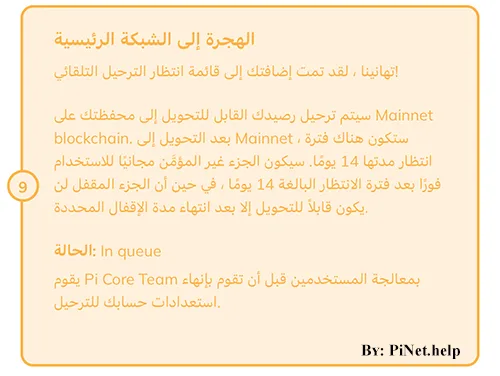 لا يمكنك إتمام الخطوة رقم 9 من قائمة التحقق بمفردك. تتم هذه العملية بشكل تلقائي وعلى دفعات عشوائية. وحتى تضمن انه سيتم ترحيل عملة باي إلى محفظتك على الشبكة الرئيسية يجب ان تكون الخطوة رقم 9 تظهر باللون الأصفر او البرتقالي. عندها يمكنك الإنتظار بصبر والتعدين بشكل يومي حتى يتم تهجير عملاتك إلى الشبكة الرئيسية.