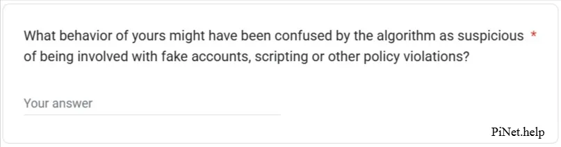 “What behavior of yours might have been confused by the algorithm as suspicious of being involved with fake accounts, scripting, or other policy violations?”