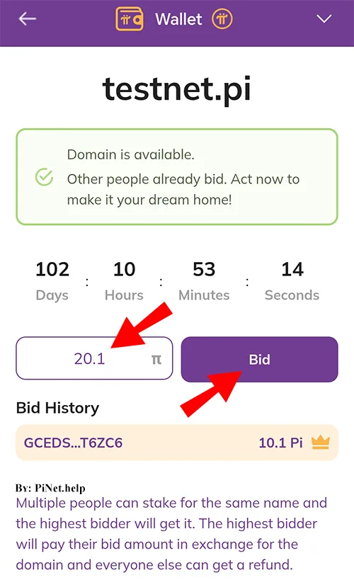 - For example, if another bidder placed 10 Pi, your new bid must be 10.1 Pi or more.