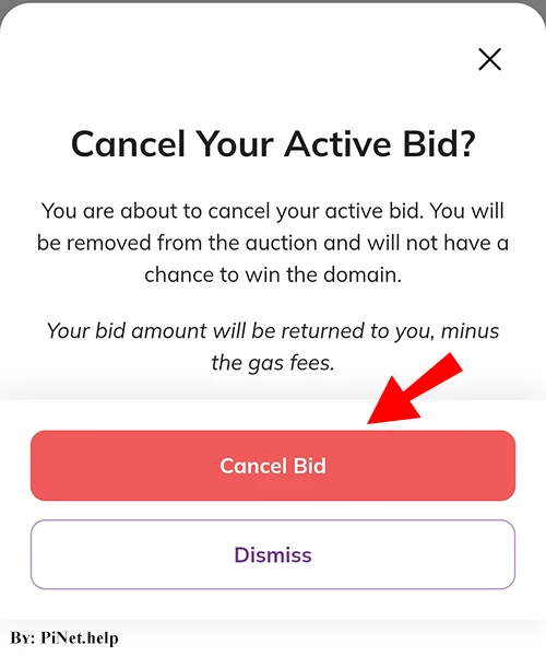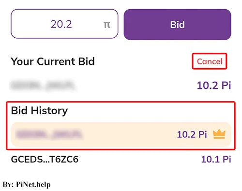 - To cancel a bid and refund your Pi, click “Cancel” next to “Your Current Bid”, then confirm by clicking “Cancel Bid”.